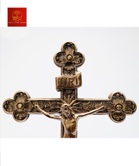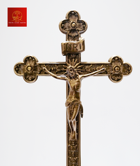 Thánh giá hoa đào có đế được làm bằng chất liệu đồng thau, công nghệ xử lý tạo màu sản phẩm mang màu sắc đặc trưng của Tâm Đức, bề mặt sản phẩm được phủ một lớp bảo vệ giúp sản phẩm không bị ảnh hưởng từ môi trường, giữ cho màu sắc không bay màu.